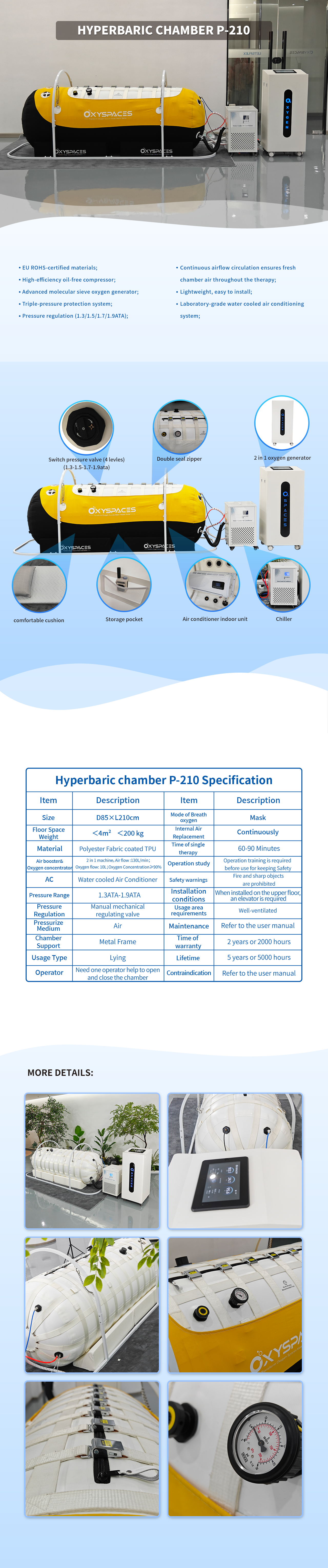 A: Customize the P-210 hyperbaric chamber to meet your specific needs and application scenarios. You may require specific sizes, oxygen concentrations, pressure ranges, or other special features, which can be customized to accommodate.